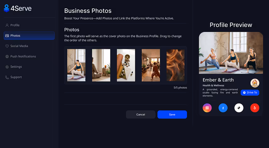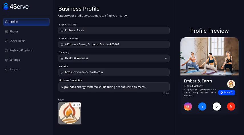 Sign up to unlock your 4Serve dashboard. Once approved, set your profile so nearby customers can find you and choose to follow your updates.